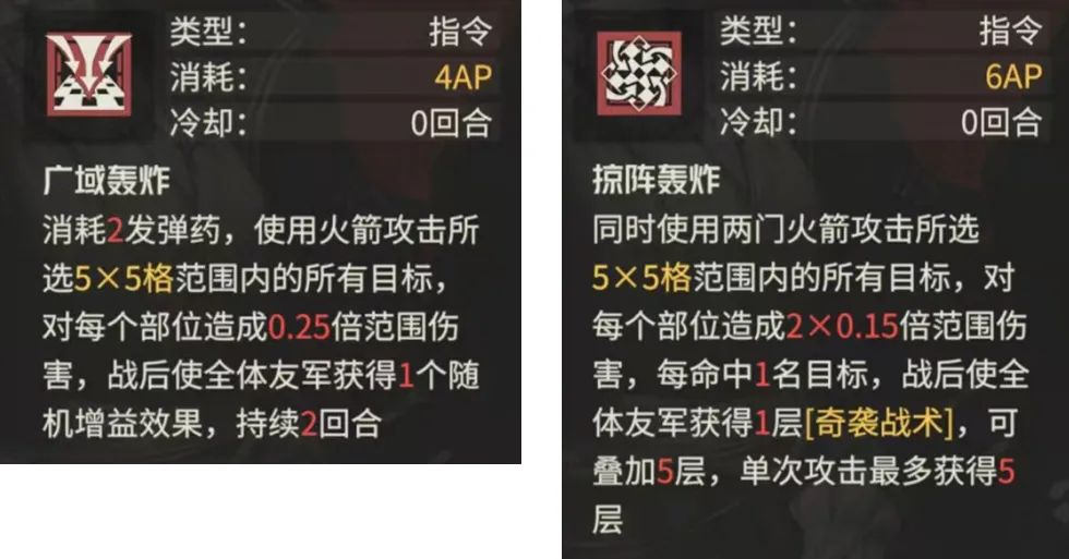 然后【掠阵轰炸】技能同样为5×5的攻击范围,伤害比【广域轰炸】略高,同时其关键是可以按照攻击到的敌人数量来提升全队的暴击率,持续1次攻击,每层15%,最高5层75%的暴击率提升......这也是此技能最大的核心优势,不过其6AP的消耗也让非5潜能的夫人想在第1回合就用出这个技能具有一定的门槛。