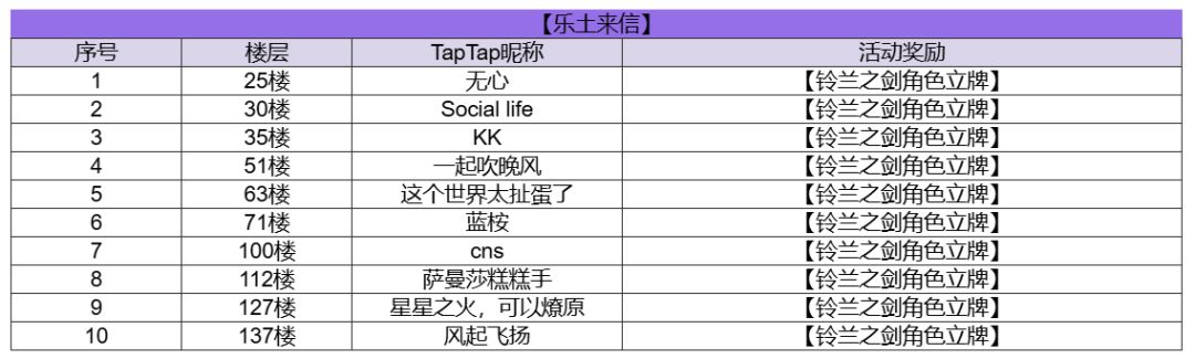 恭喜以上团长在【乐土来信】活动中获得【铃兰之剑角色立牌】,请中奖团长于3月6日 12:00 前添加 QQ:1411461039 完成收件信息登记,逾期视为放弃获奖资格。
