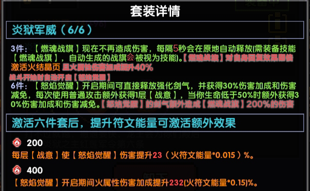 6件:新增战斗开始时自动开启【怒焰觉醒】,且【怒焰觉醒】的剑气额外造成【燃魂战旗】200%的伤害。
