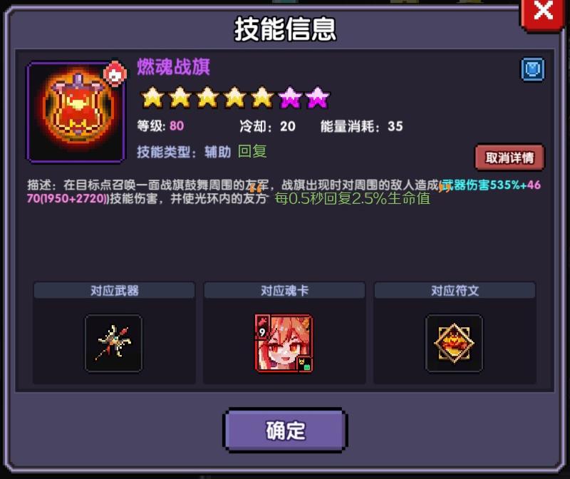 四星效果:处于【燃魂战旗】范围内每0.5秒回复5%大生命值→处于【燃魂战旗】范围内技能伤害提升30%