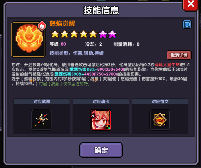 【怒焰ll】:怒焰觉醒基础伤害+100%,【怒焰觉醒】攻击间隔减少0.2秒