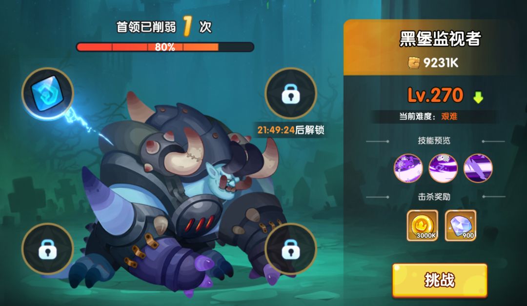 每通关三章主线有一个这种boss,比较难打主要靠花木兰,能削弱四次,第一次6小时,第二次一天。