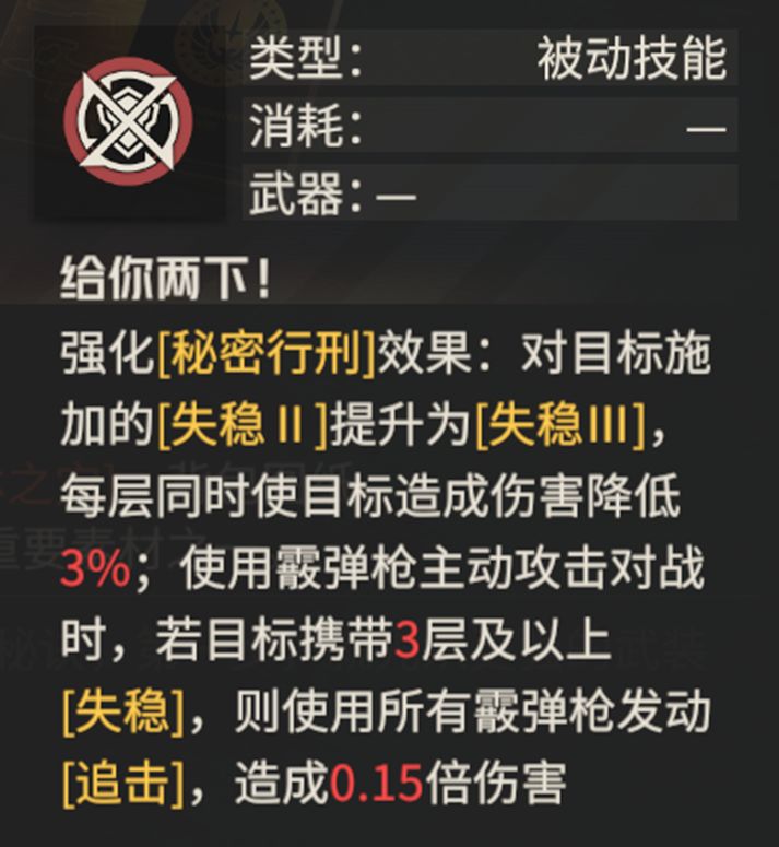 其次,使用双枪流面临的生存能力降低的问题,专武亦有对应补偿,为失稳效果新增了造成伤害降低效果,在叠满情况下,有15%减伤,大致相当于手盾的减伤,这在一定程度上可以弥补生存能力的降低。