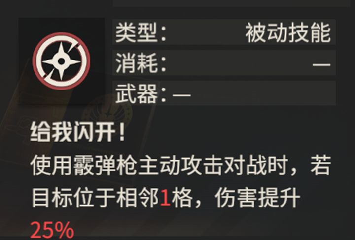 通用技能,使用霰弹枪主动攻击时目标位于相邻1格则伤害提升,霰弹枪的最佳射程正好就是1格,这个技能可以说是非常契合霰弹枪的,但是与芙烈达会产生些许冲突,芙烈达γ2具有击退效果,在没有负载强袭的情况下,原地二次攻击相同目标,第二次攻击会因第一次攻击的击退而失去增伤