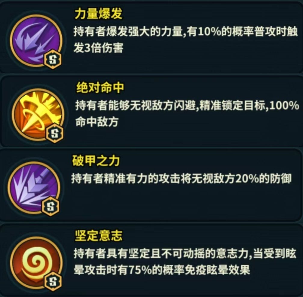 接下来便是破甲,游戏内由于有破防机制的存在,攻击跟防御差距过大时就很难造成伤害,这时候破甲的作用便显露出来了,可以有效地提升我们的输出,减少不破防的现象,这里把它作为仅次于绝对命中的下一个技能。