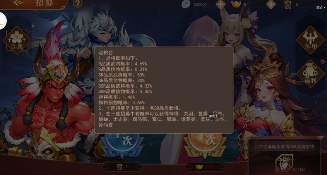 第一点,开局抽卡,十连,不用单抽。0氪开局能抽卡次数有限,礼包码领完大概40抽左右(注意不用使用一次性礼包码,开局先用通用礼包码刷个好将,打算玩了再消耗一次性的签到码)。在前中期游戏里,作者把武将简单划分为输出、治疗、辅助、前排这4种,作者建议适合开局的输出武将首选郭嘉(爆发快,橙卡易获取)、张颌(群攻真伤,橙卡易获取)、祝融(能抗能打,橙卡易获取)、孙尚香(真伤爆发,神将难得),治疗武将包括华佗(奶王0突破即可,但属于神将,获取较难)、大乔(第二奶,橙卡相对易抽)、刘备(能抗能奶,橙卡可许愿)、蔡文姬(紫卡极易获取,但奶量不大),提供buff加成的辅助武将加成包括司马懿(强控无敌,神将难得)、诸葛亮(减怒复活,神将难得)、曹操(加怒减怒,神将难得)、鲁肃(前排嘲讽,减伤加盾,紫卡极易获取),最后前排武将有曹仁(三国最肉,神将难得)、孟获(全面坦克,被动会后撤,神将难得)、吕布(极限输出,作前排最好极限培养,神将难得)、关羽(群攻控场,神将难得)、周泰(不死小强,后期英雄,橙卡易得)。前期输出1位即可,现在这个版本需要本体才能突破,因此突破难度加大,优先突破顺序:输出武将》前排武将》辅助武将>治疗武将。作者开局:郭嘉+大乔+吕布+华佗+鲁肃,第一天10章轻轻松松。微氪玩家抽卡次数主要来源推图,前期建议神将、橙将各集中一个优先+9。注意:没有上述输出武将或前排神将开局,弃号重开!!!