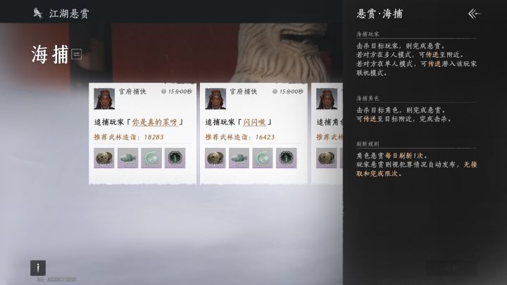药品,在接取悬赏开始,有15分钟的时间,过时无奖励,被捕者进入cd,其间不被悬赏。