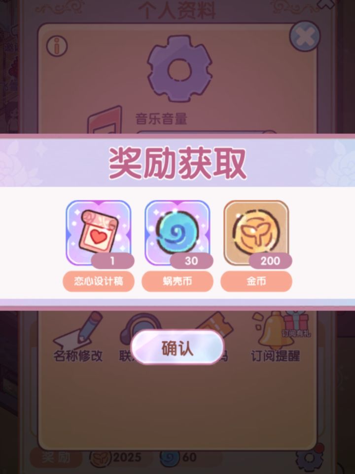 兑换奖励:恋心设计稿×1、蜗壳币×30、金币×200