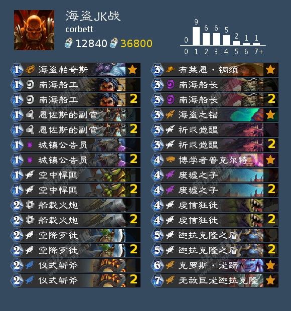 corbett的海盗JK战,FAGUOREN用这套牌打到了美服第四。(我得吐槽下,这个FAGUOREN是个美国人,他和我说他知道这个词就是法国人的中文拼音,也没有别的意思...)JK战在上个月的黄金狂野线上赛有非常不错的胜率和出场率,主要是能counter宇宙牧,天梯也有一些选手用JK战打高分段,但是JK战的问题在于前三费回合过于薄弱,很容易被巨化德单刷,奇数骑挂上永不屈服也能躲过祈求觉醒的射程,同时前期攻势太弱,打奇迹法也比较吃力。这套在传统的JK战上融入了海盗体系,一定幅度上增强了前期的作战能力,南海船长和空降歹徒增加了这套牌的上限。相比纯种海盗战,又多了中后期的作战能力,打出博学者后直接高费连拍谁也不爱。短板就是前期猛完了又抽不到博学者会很尴尬。