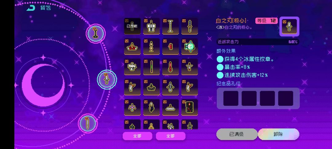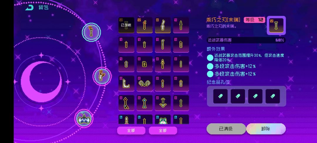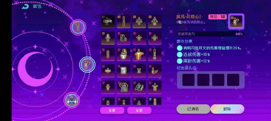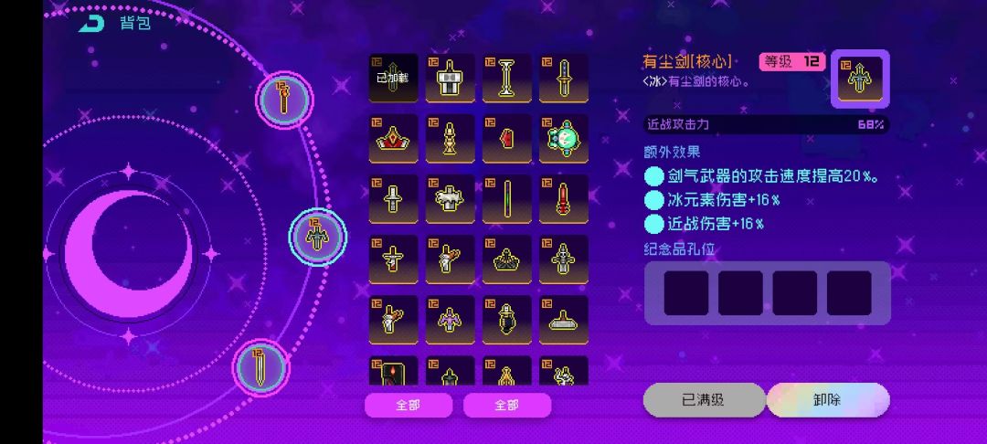 零模梅选择有尘剑前端,白之刃核心,越王剑末端,纪念品方面选择了带毛巾也是考虑到零模梅输出并没有那么暴力,可能秒不掉怪,需要保命,就把粒子刀换成了毛巾。