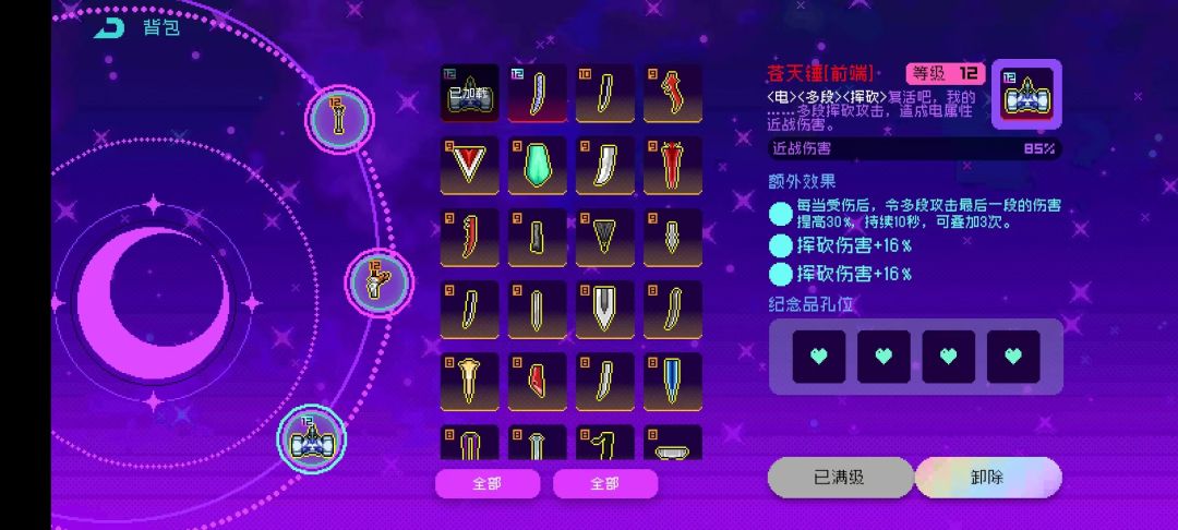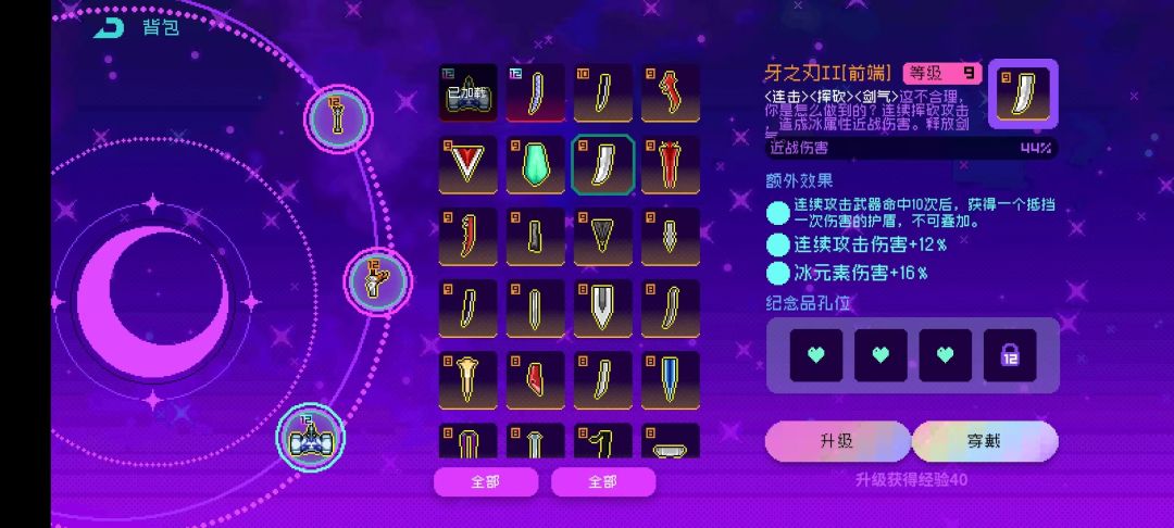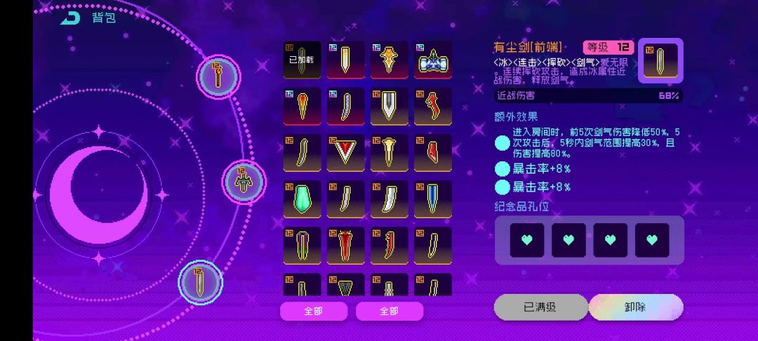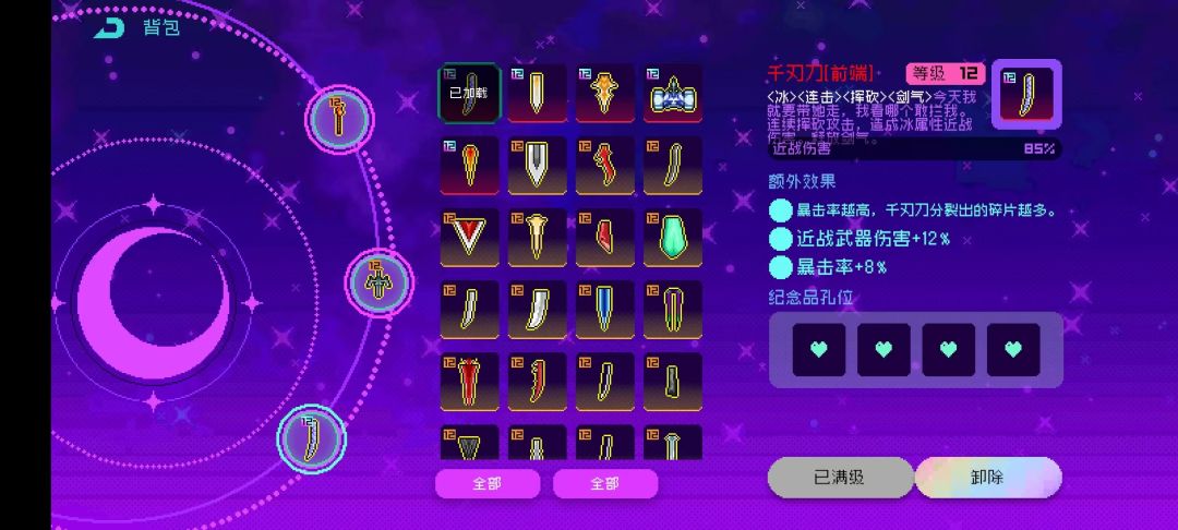 这个出装选择千刃刀前端,有尘剑核心,疾风β末端,纪念品方面使用的是全输出纪念品,如果觉得生存有压力的小伙伴可以把粒子刀换成毛巾。之前的测试中发现指虎可以虚空生效,带蝴蝶是为了增加暴击伤害,星海中暴击率很高。