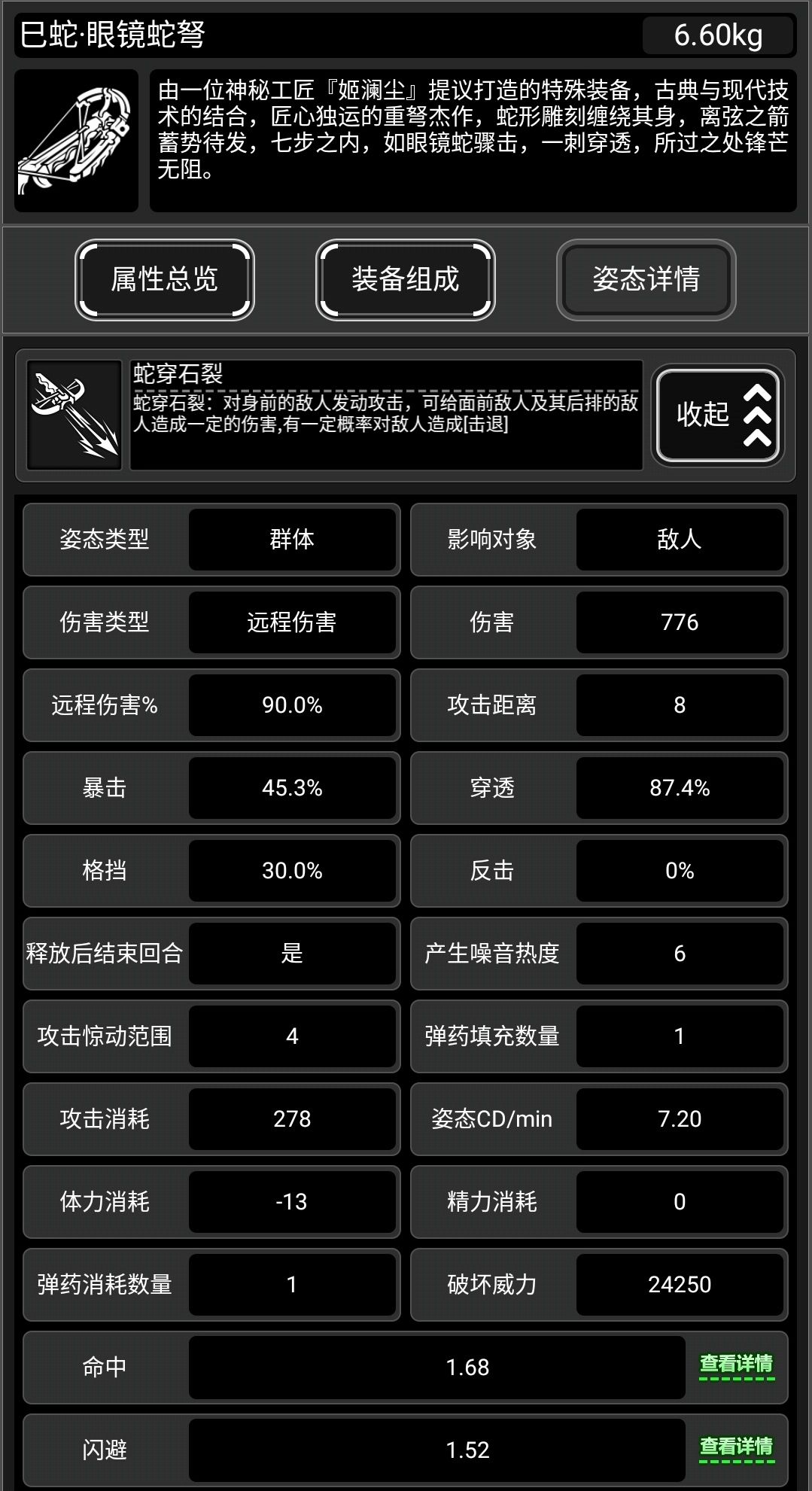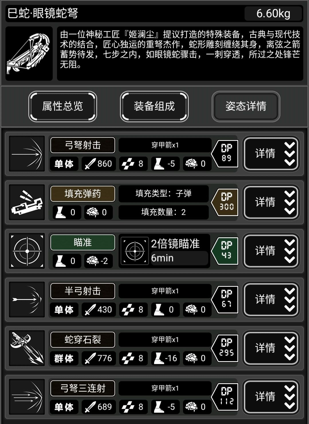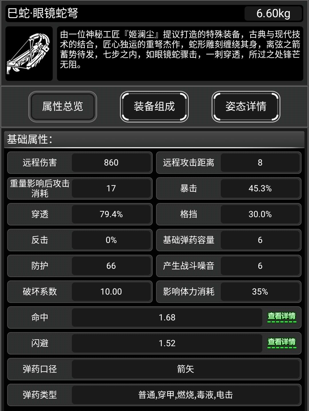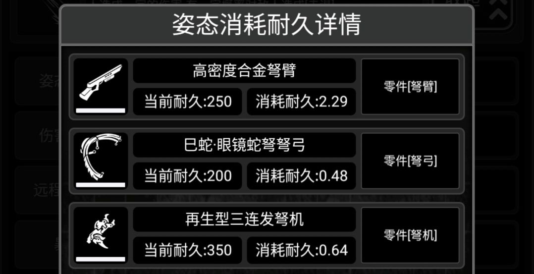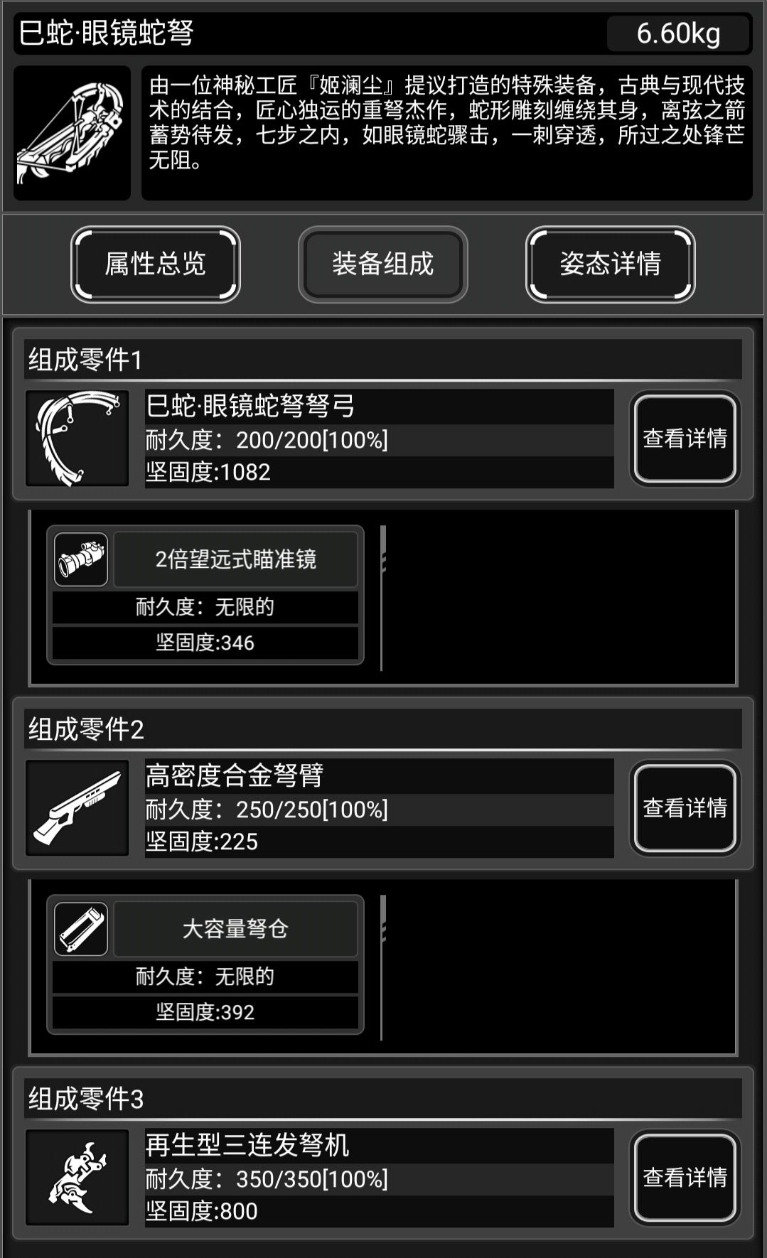此武器有原身,重型弩弓,所有零件组成已经获取方式可以去看原身的帖子,这里就看一下满配和特殊姿态。
