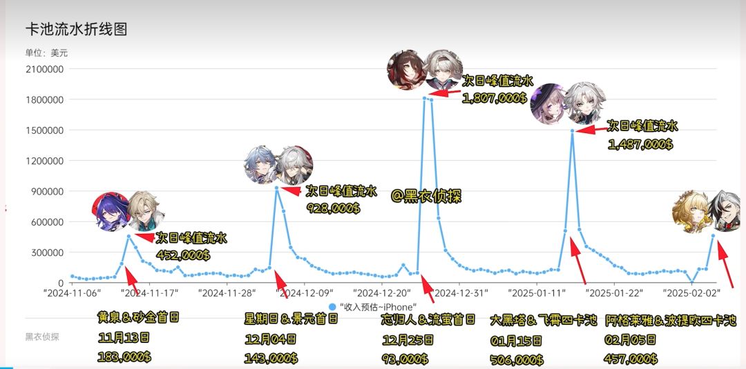 昨天3.0下半卡池也是直接开启了,又是四卡池的配置,先五星角色阿格莱雅也如期而至,复刻角色为知更鸟、银狼、波提欧,看到银狼就有点感到尴尬,主要都说后续的风智识那刻夏就是大银狼的存在,好在昨天官方宣布了后续版本对老角色要整体加强,流水折线图如下,主打图一乐,具体要看商店排行榜数据来说话。