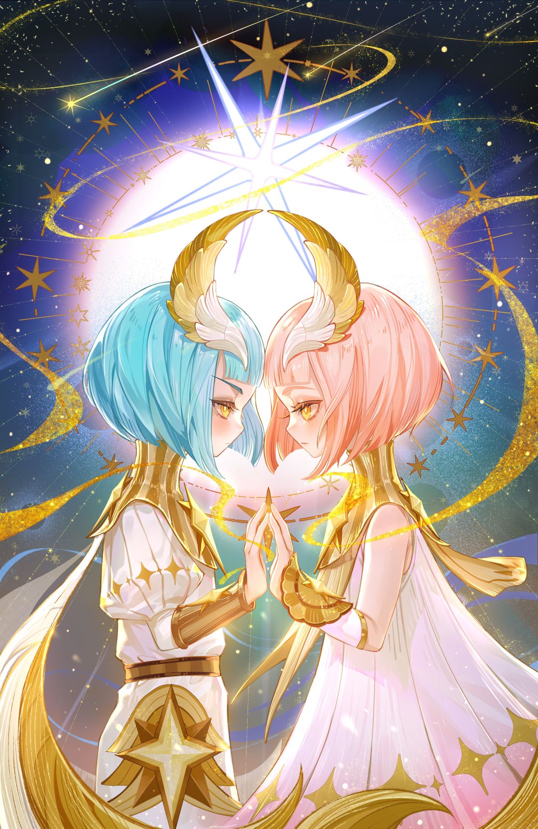 在星光的照耀下,伊莱亚与莱拉彼此凝视,双手交叠,仿佛在无声诉说命运的羁绊。两位命运织星者,以星辰为针线,为世人编织着和平的未来篇章。