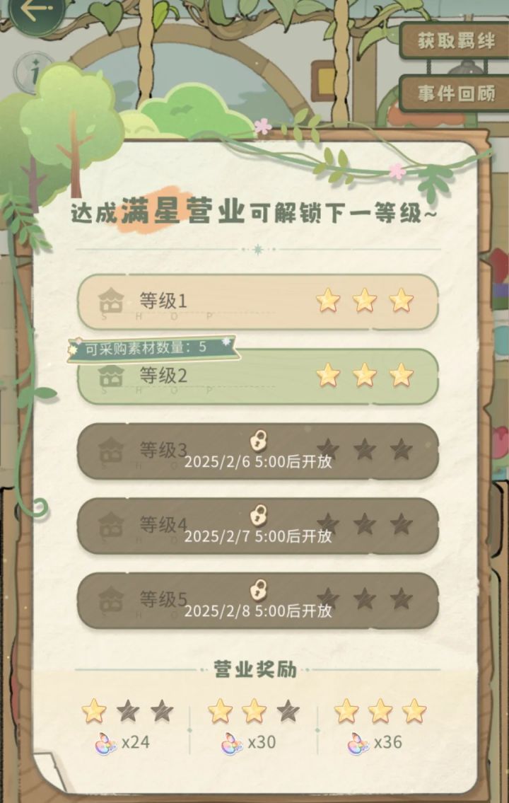 今天上线参与森林奇旅营业,可获取的装饰提升到5个,完成营业可以把等级提升到2级。