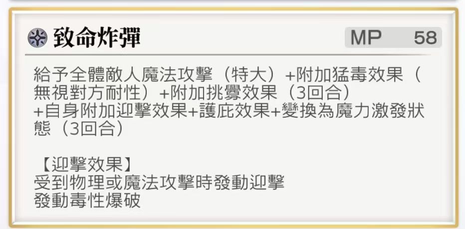 五星固有技能-【致命炸弹】:给予全体敌人魔法攻击(特大)+附加猛毒效果(无视对方耐性)+附加挑衅效果(3回合) +自身附加迎击效果+庇护效果+变换为魔力激发状态(3回合)