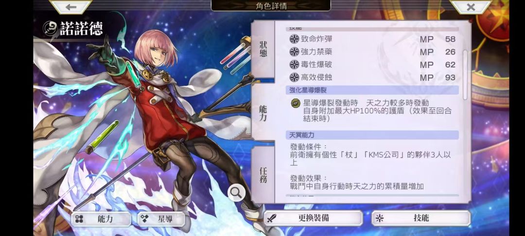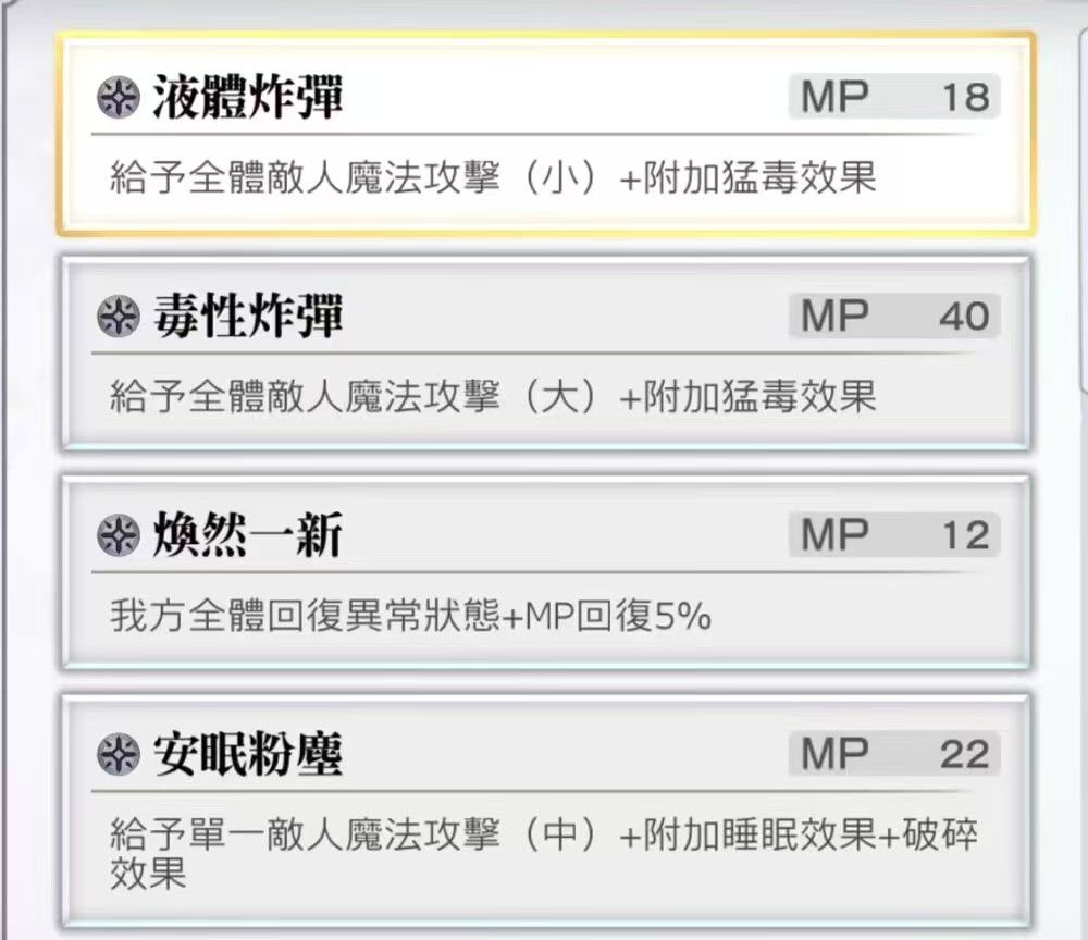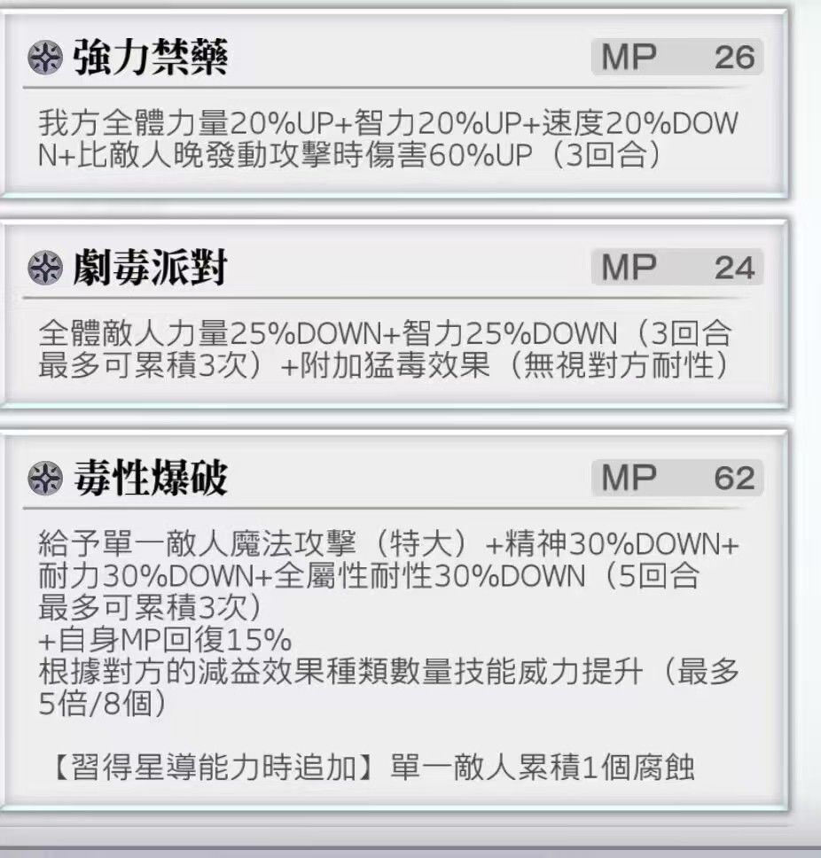 五星习得技能-【毒性爆破】:给予单体敌人魔法攻击(特大)+精神30%DOWN+耐力30%DOWN+全属性耐性30%DOWN(5回合最多可累积3次)+自身MP回复15%,根据对方的减益效果种类数量技能威力提升(最多5倍/8个)