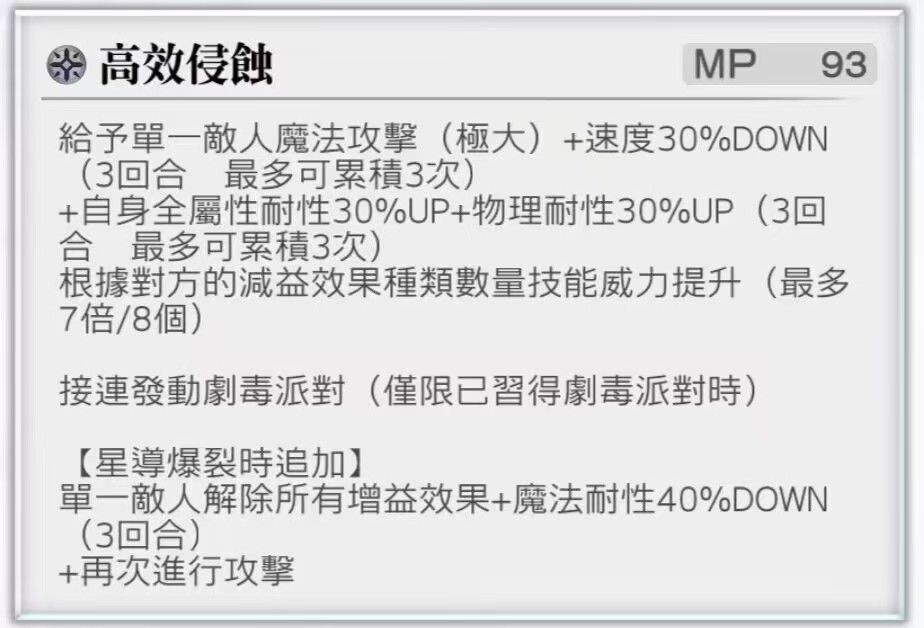 星导技能-【高效侵蚀】:給予单一敌人魔法攻击(极大)+速度30%DOWN(3回合 最多可累积3次)+自身全属性耐性30%UP+物理耐性30%UP(3回合最多可累积3次) 根据敌方的減益效果种类数量技能威力提升(最多7倍/8个) 接连发动【剧毒派对】