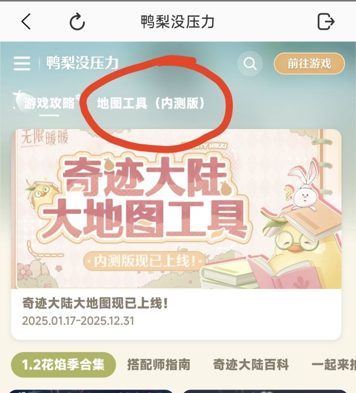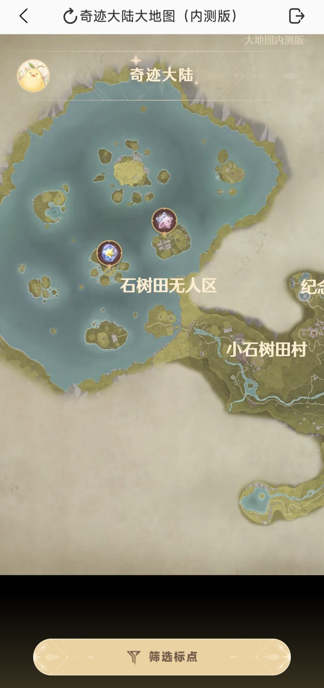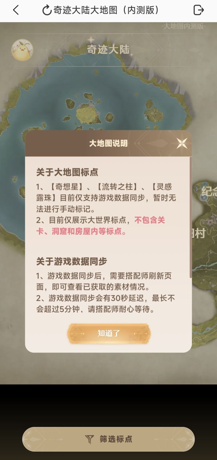 打开美鸭梨,点击右边第一个小图标。进去后,点击地图工具,然后再点击美鸭梨头像,允许它获取你的游戏信息,方便寻找遗漏的奇想星和灵感露珠。可以点击下面的筛选标点,里面有很多东西,想要寻找的材料、奇想星、灵感露珠都在里面可以找到