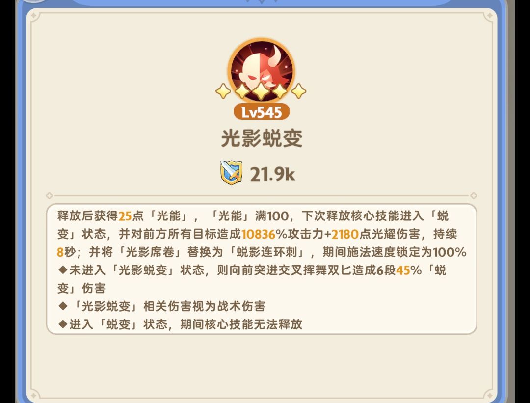 1. 变身后会依次造成400%,4次50%,6次15%,6次15%光影蜕变伤害(用技能倍率描述更直观)