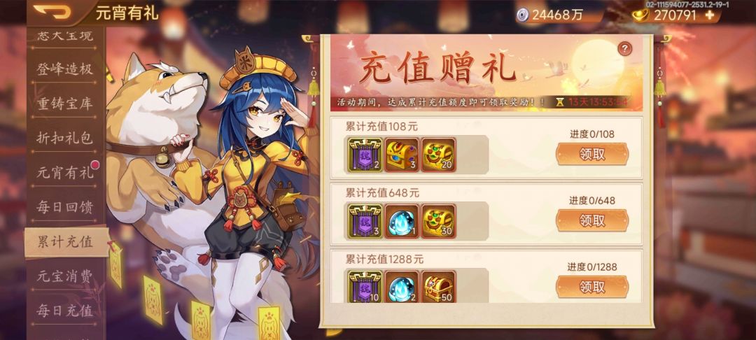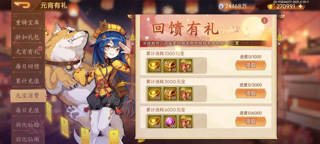 活动内容:活动期间,累计消费元宝达到目标值即可领取奖励!
