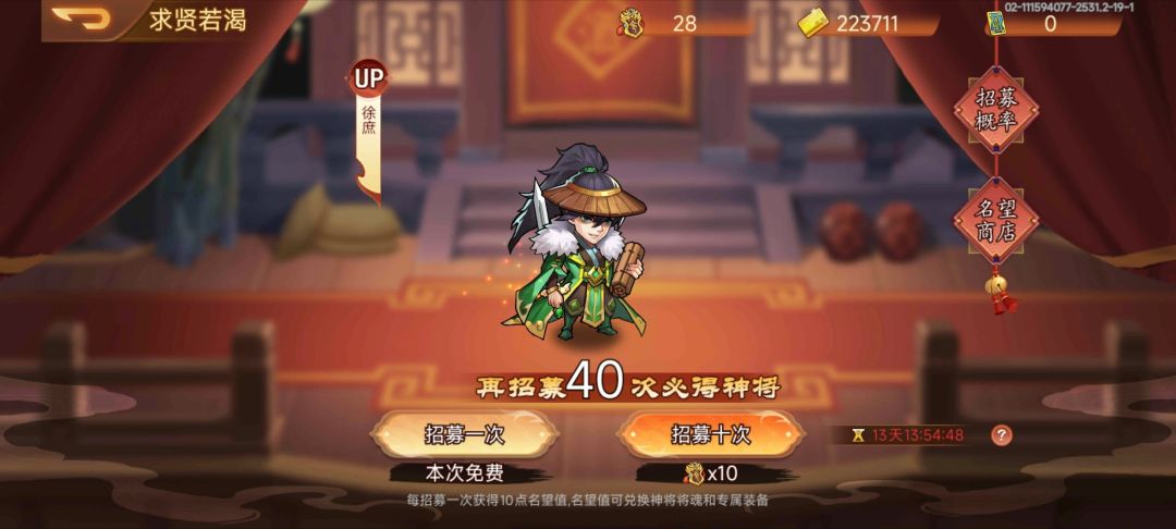 活动内容:活动期间,可通过消耗招募令进行招募武将,up武将的概率会高于其他同档位武将(每期活动会更换up武将),每次招募可获得10名望,名望可在名望商店兑换道具;