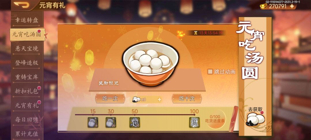 活动内容:活动期间,完成任务可获得汤圆,吃汤圆随机获得道具奖励,吃汤圆达到一定数量,还可额外获得奖励。