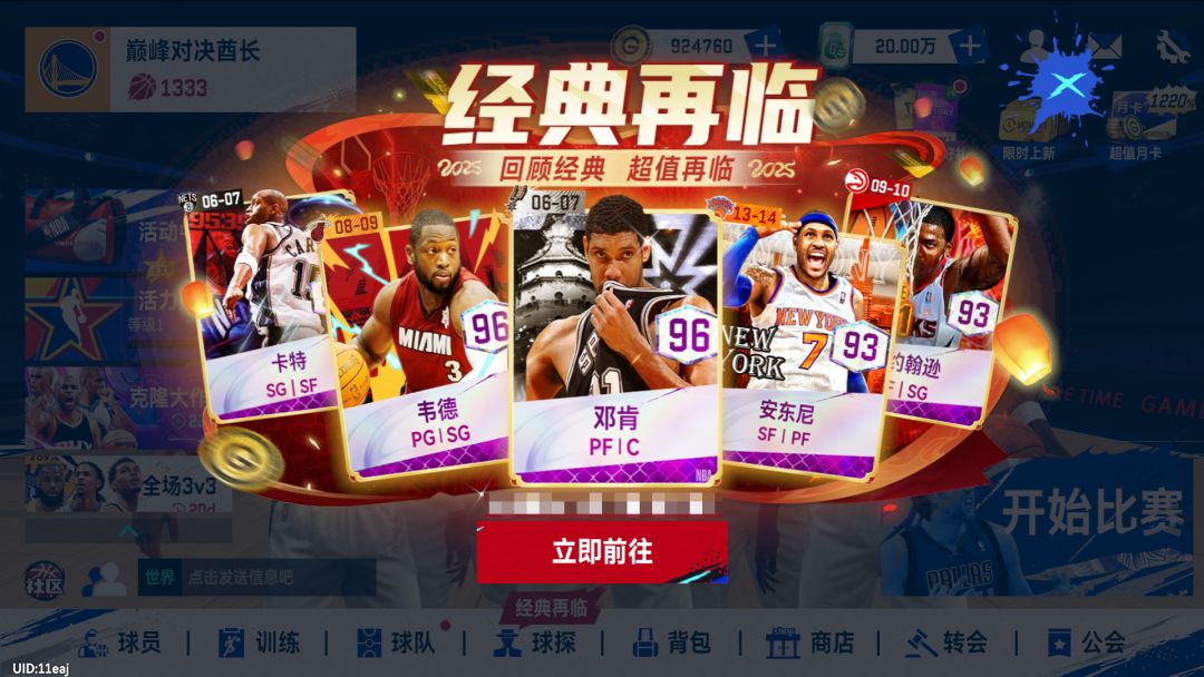 【经典再临】经典卡池上线,热门经典紫卡球员邓肯、韦德、卡特、哈达威、德雷克斯勒、安东尼、约翰逊、汤普森限时返场酷炫卡面和球星等你获取!
