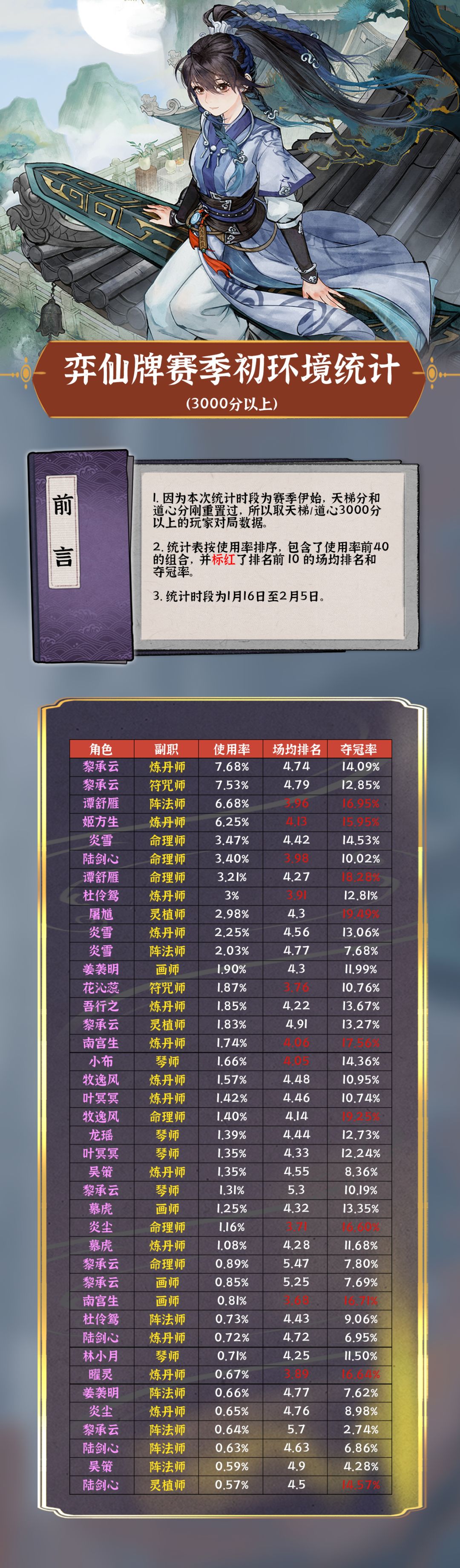 因为赛季刚开,本次为3000分以上的玩家对战数据,统计时段为1月16日至2月5日。