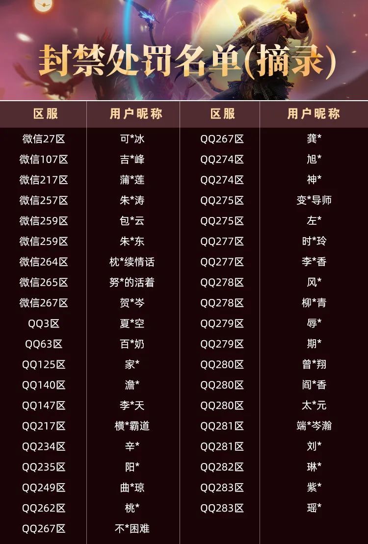 经统计,一月累计封号处罚11697个,其中38个账号已被采取全区封禁十年的顶格处罚(含“坐挂车”,瞬移,雷达等违规行为账号),以下为一月经官方核实后给予封禁十年处罚的账号信息(部分摘录):