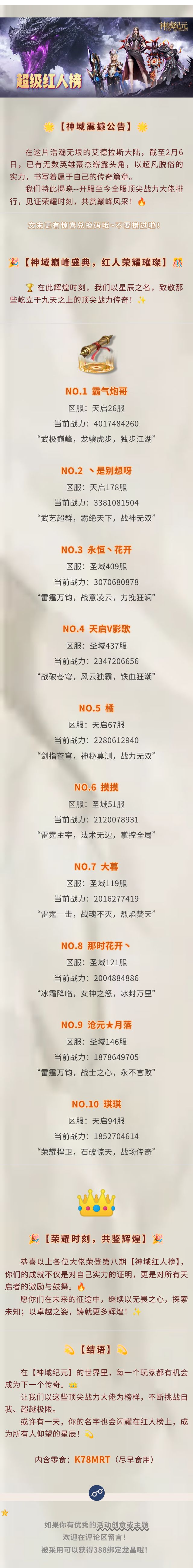 【神域纪元】红人榜丨第八期震撼来袭!