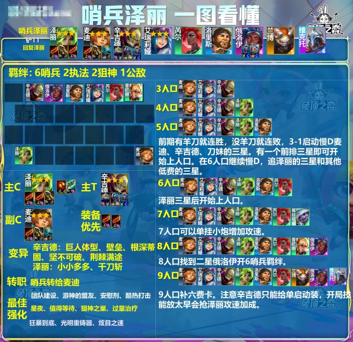 阵容核心:6人口由泽丽、麦迪、刀妹、辛吉德、芮尔、日女组成4哨兵2狙神羁绊。7人口可以补小炮增加攻速,小炮外交可以给三星弈子增加百分之18攻速,收益很高。8人口找俄洛伊开6哨兵。兰博来了替换低费哨兵。9人口补白嫖的六费卡或五费二星。