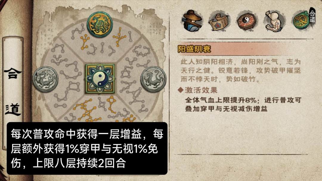 增益名称【天行健】:普攻需要命中,命中后获取1%穿甲和无视敌方1%免伤,上限8层,持续三回合。