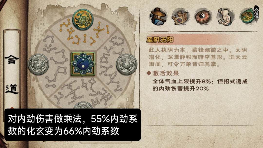 施展附带内劲伤害招式时,×120%内劲系数。化玄十一剑每段都能吃到。若为龙枪等130%内劲系数套路,则提升后为130%×120%=156%系数。