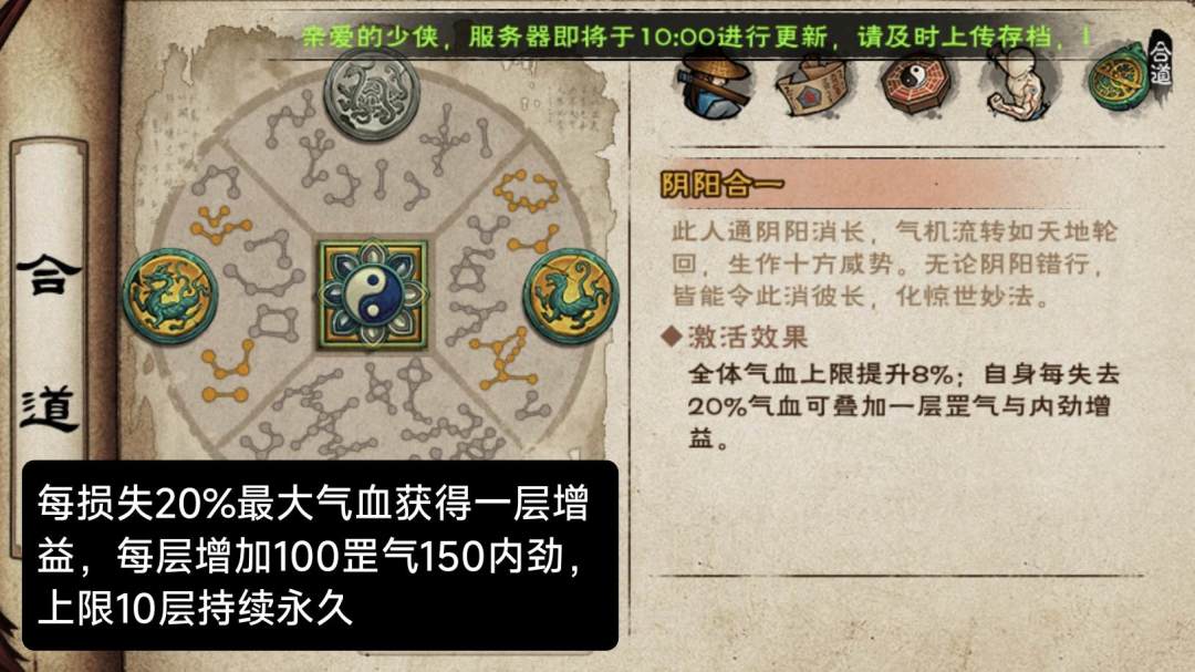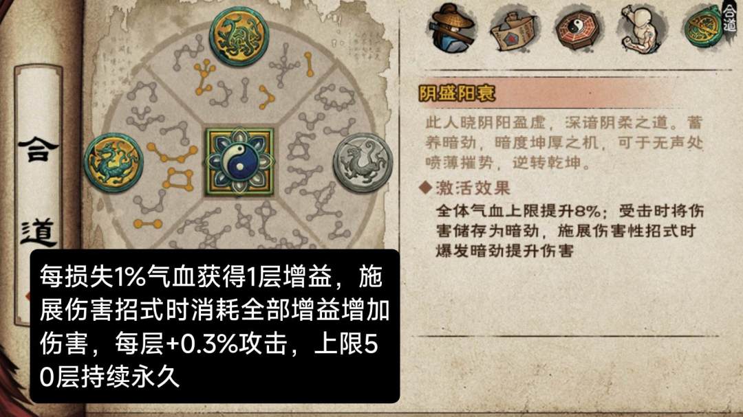 增益名称【此消彼长】:每损失20%气血,获得一层增益。每层+100罡气+150内劲,持续永久,上限10层。