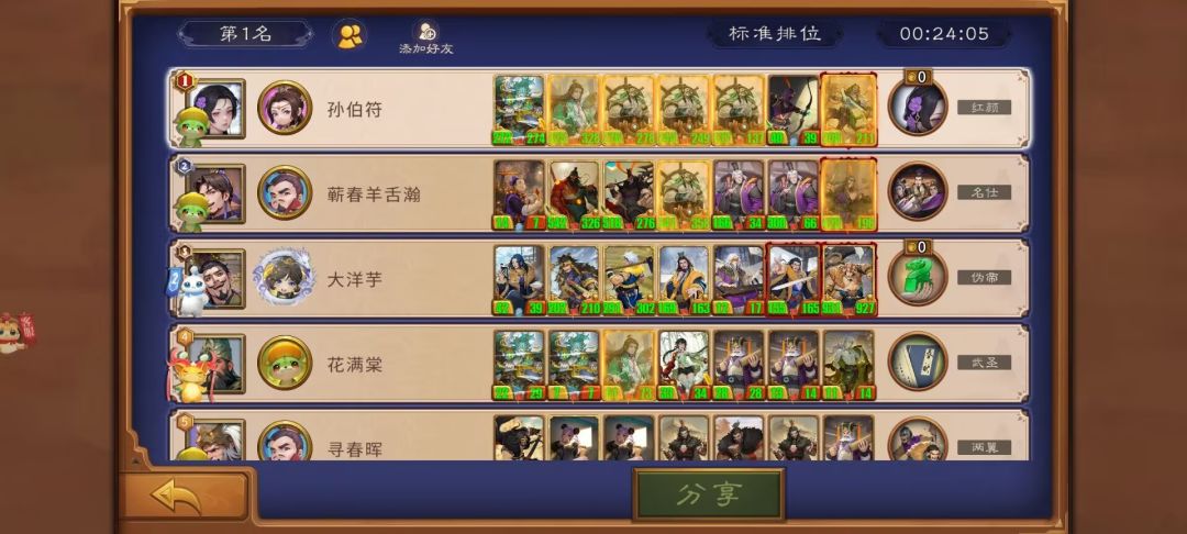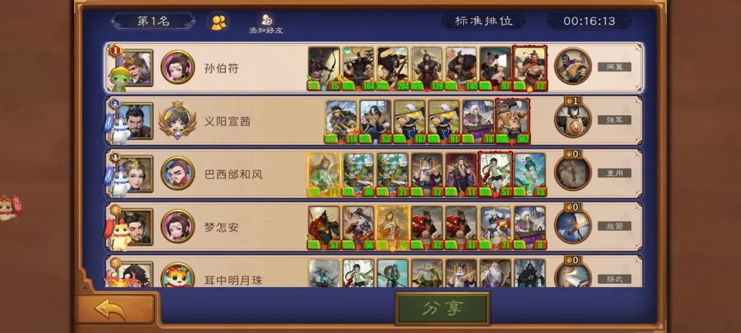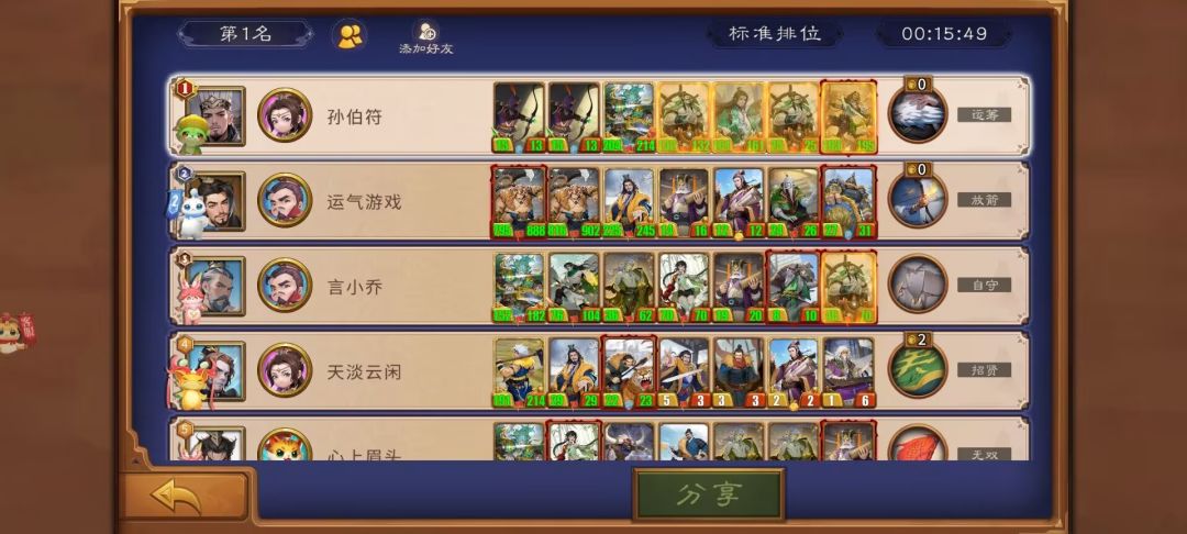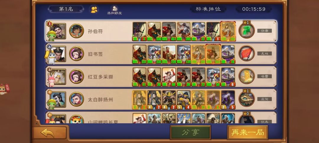 这局找不到张辽,且就算有张辽估计也因为攻击不够切不掉后排,所以利用毒弓后置切对面核心,结果运气也不太好,虽然最终切掉了大良贤师,但不是第一时间,加上其他卡的质量太低,惜败。结果不好,但思路可以借鉴,后置毒弓克黄巾在许多阵容里都能起到奇效。