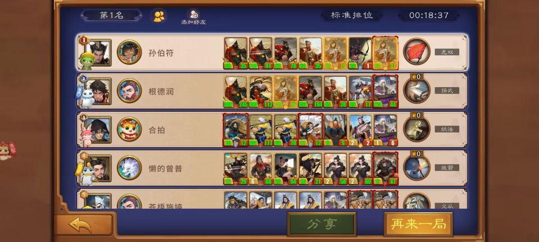 这局运用的是再起毒弓,做出这种选择是根据上回合的战况决定的,当时我手里有一张再起技能卡。配合毒弓可以达到毒杀张辽及对方大嘲讽的目的。所以毒弓的站位选择一号位。一张卡完美处理对面两个主要威胁点。虽然最后对手没有上满怪....
