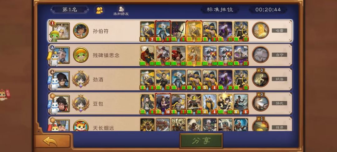 这一局对方的英雄技能为庇佑,所以基本是全员圣盾,因此,一号位烟花弹进行破盾是最优解,针对对方多圣盾阵容,烟花弹必备,如果一局游戏中,有孙坚且对方阵容强度跟你相差无几,那么在半决赛(场上剩下3或4人),就要有意识的存一张烟花弹了。