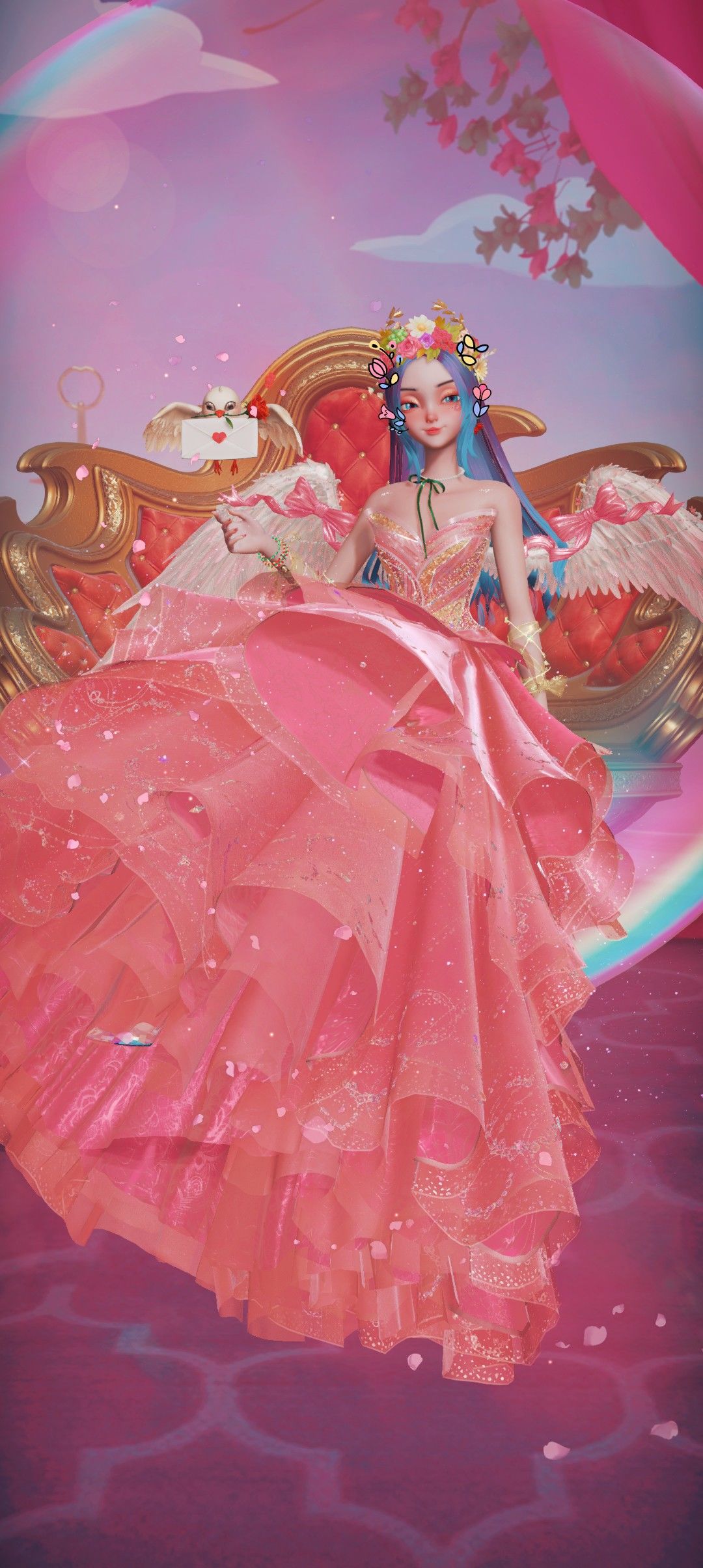 粉套鸽子有点是肥啾,可以试着做简约款搭配,粉套翅膀不能飞,没有特殊动作😡差评igg,红套裙子质感很不错,喜欢后面的大蝴蝶结,悄咪咪的发现两次联动的粉套摆件动作叠加效果