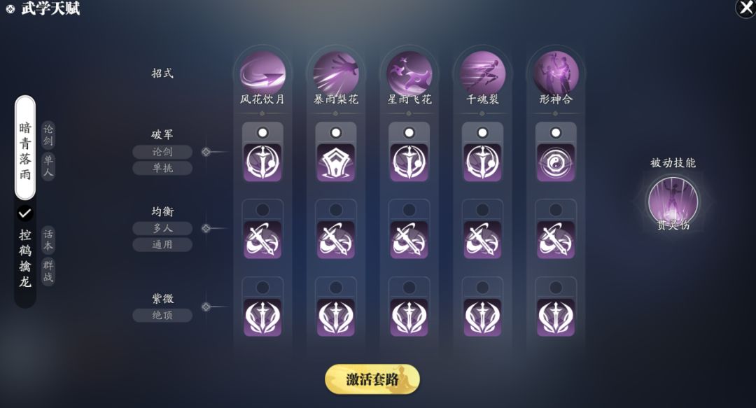 此套方案有4种不同的选择,主要围绕天赋1是选择“霸体”或“增伤”,天赋2选择“减疗”或“增伤”。少侠可以根据自身联赛的情况选择。