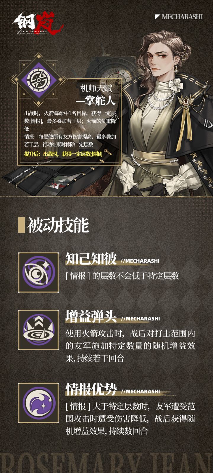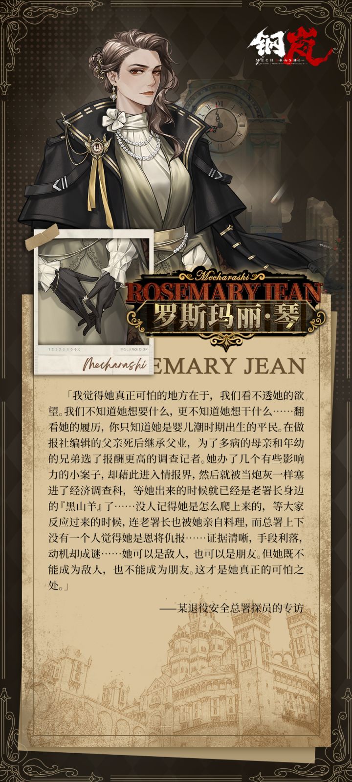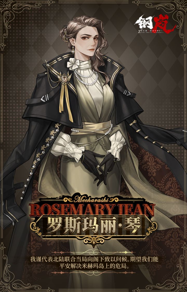 罗斯玛丽·琴,北陆联合的传奇特工与政治巨擘。作为一名特工出身的高阶政治人物,罗斯玛丽并不单纯依赖传统的战术技能,而是将她的情报能力与领导魅力注入战场。虽然她并非传统意义上的前线指挥官,但她那敏锐的判断力与战略眼光,总能给战局中的其他友方带来大量的信息优势。假如战场是波诡云谲、暗藏惊雷的大海,那她便是历尽波涛、敌过塞壬的掌舵人。