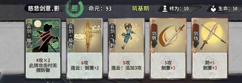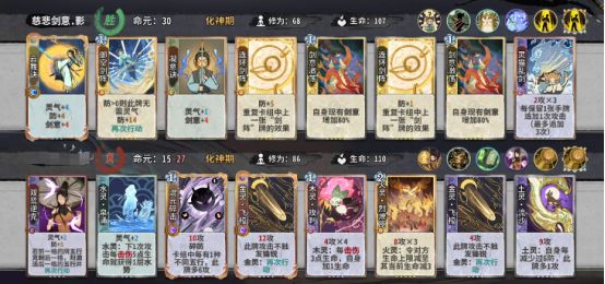 金丹:逐渐转向传统剑意套,目标是10剑意,手上至少有1张猫薄荷,轮指只留1张过渡,多的d掉,9轮上元婴。7-8轮是猫魂轮次,7-8轮遇到速杀的,可以下所有带攻的牌,上慈念吃猫魂。金丹不要着急d狂舞,剑意不够时,元婴可以用狂舞替代剑意。