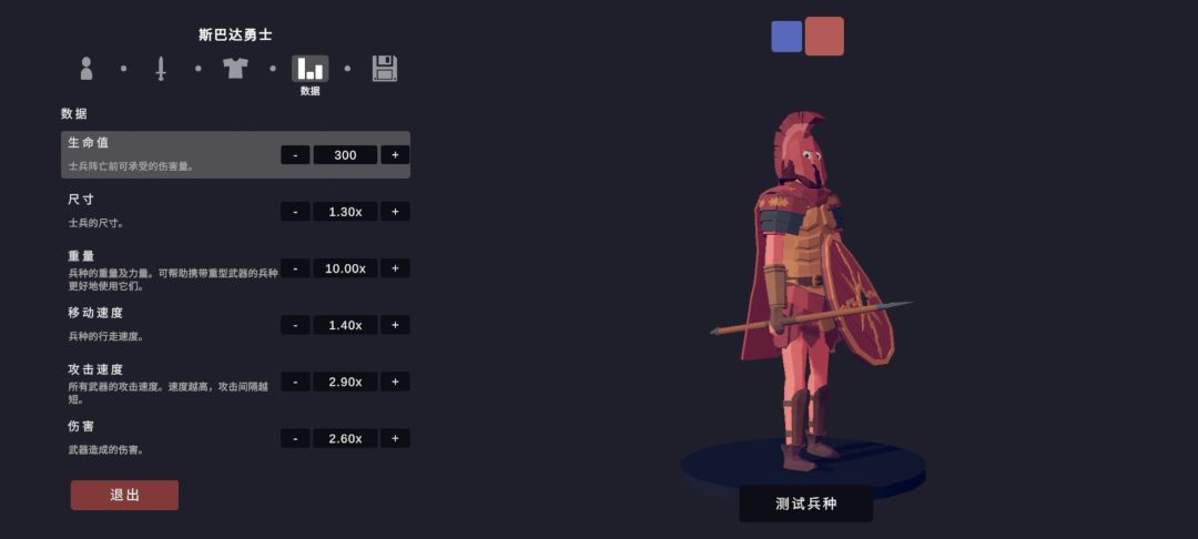 斯巴达步兵的进阶版,这不妥妥的斯巴达形象了吗这不是😋,我在斯巴达标枪兵那篇说过,斯巴达的灵魂是投标枪和长矛配盾牌,再加上少到可怜的防护妥妥的猛将一个顶十个的形象。这期给大家分享的兵种就是这个系列的灵魂了,斯巴达勇士,身着高级古罗马统帅甲,配备禁卫军将领盔,身上盔甲泛着金光,膂力过人武力高强,并且拥有相比普通士兵更顽强的生命力(更厚的血),更熟练的武器技巧(攻击速度更高),还配备了骑士冲锋的技能(盾牌终于能起到应有的效果啦😀),在接敌的一瞬间就能将敌人撞飞出去甚至可以跟牛头人冲个五五开还掌握双重将军闪避技能,闪的更快而且还位移精准,妥妥的一个打十个的样子嘛。其实实测打古代重步兵一挑15不是问题,打国王也是五五开猛的很,很符合想象中的斯巴达300勇士形象的了,