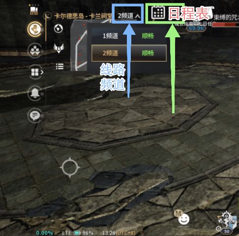 2.线路频道在左上方日程表图标的左边,如果当前地图线路拥挤,就会自动开启,点开就可以看到其它线路频道,点击想去的线路频道即可换线。