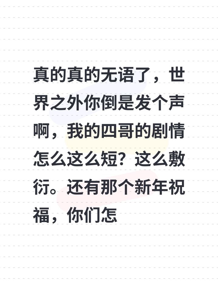 真的真的无语了,世界之外你倒是发个声啊,我的四哥的剧情怎么这么短?这么敷衍。还有那个新年祝福,你们怎么弄的?有病呀?