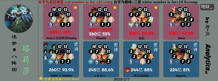 经过一轮的测试,八阵图方案可行!在尽可能保证阵容多样化的同时,选取八个高伤阵容供参考~要说的话都放图里了!