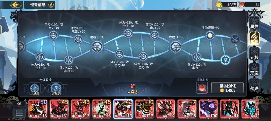 然后然后把一技能减增益时间的技能调满可以克制荧和崩 祈提真实伤害的那个技能也可以升只不过必要性没那么大 然后剩下的就是保她生存就完了大基因全用加射程的小基因用减攻击力增加体力的可以弄个御守或者重生宿命上 原核如果没什么资源的话也可以不用做(指词条上)极化上可以种子和等级几乎是每个怪必须的 然后剩下的搞个心脏甚至祈这个怪你连等级都不用弄防止其暴毙就行