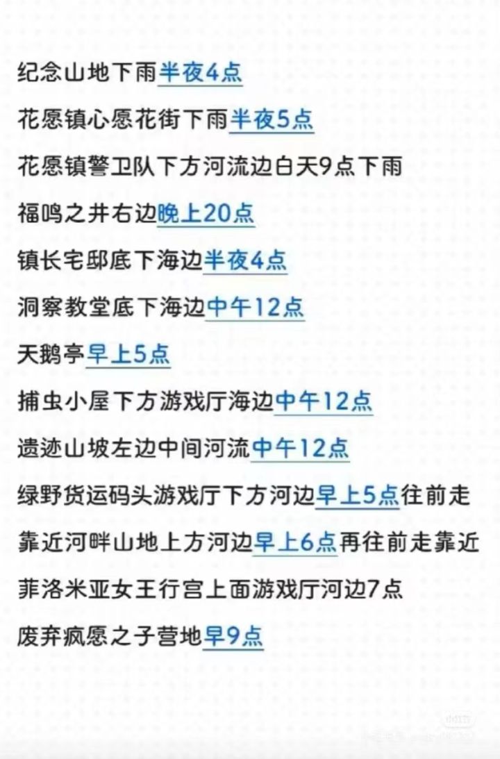 别人发的,我自己试了试,不太准,仅供参考,我推荐在心愿花街调时间刷下雨天气