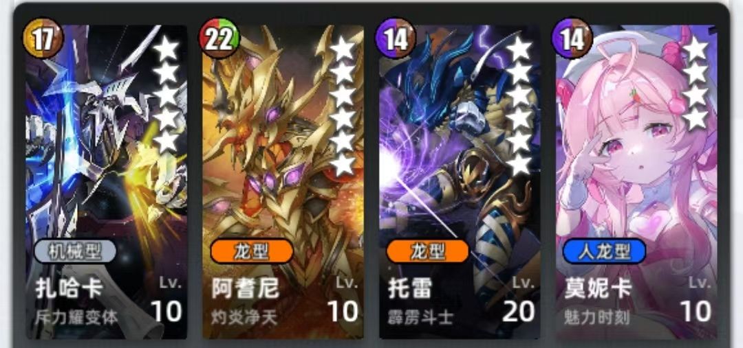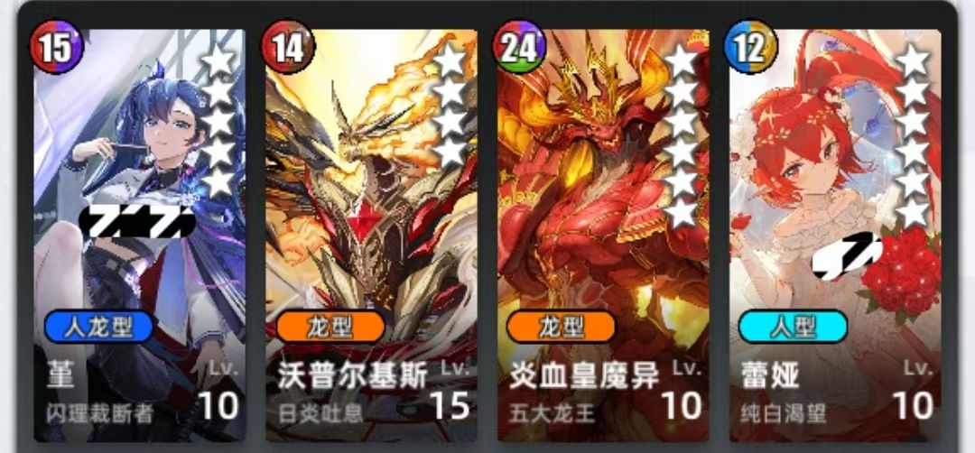 第二种更贴近刀队,需要利用刀潮,炎血皇魔异是比较合理的搭配。另外2张是辅助位,主要考虑启动,充能,4消,上虚弱。有多种选择,图里用了比较古典的,比如2号可以用妮娅,悠闲换1号位之类的。4号可以用恶妒,鱼鳞小刀啥的。短板是启动。