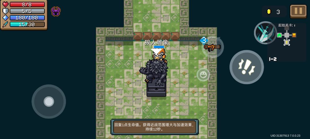 1.【狼人雕像】——回复1点生命值。获得近战范围增大与加速效果,持续12秒。